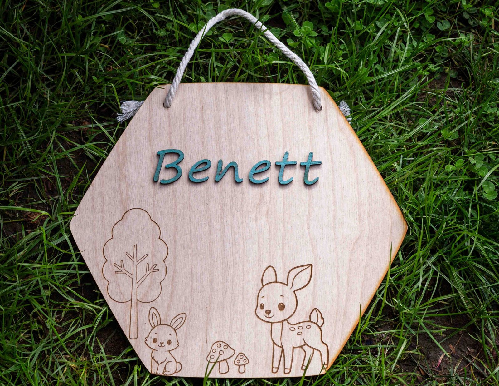 Egyedi fa névtábla – Erdei motívumokkal (hatszög, 25 cm)