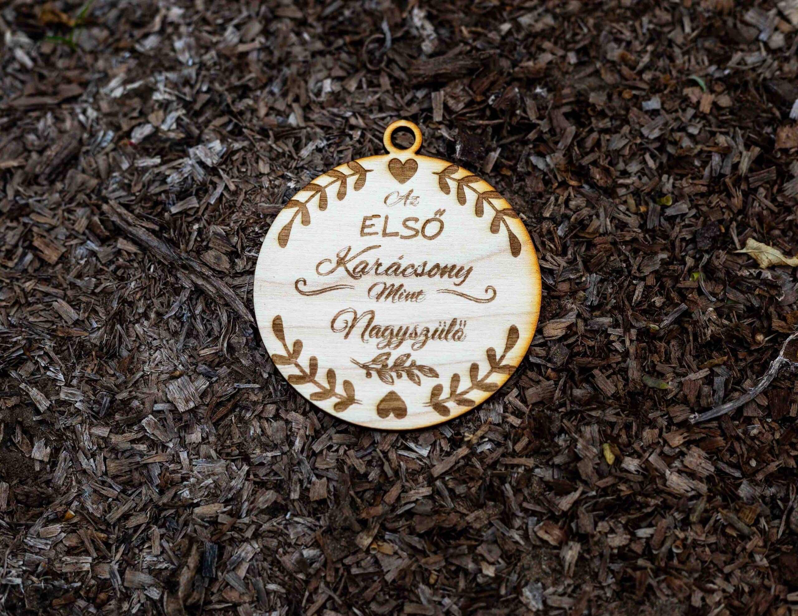 Különleges, 4 mm vastag nyír rétegelt lemezből készült karácsonyfadísz, amely tökéletes kiegészítője az ünnepi dekorációnak. Az Első karácsony, mint Nagyszülő karácsonyfadísz – lézervágott és gravírozott 8 cm átmérőjű díszek modern lézervágással és precíz gravírozással készülnek, így minden darab részletgazdag és természetes hatású.