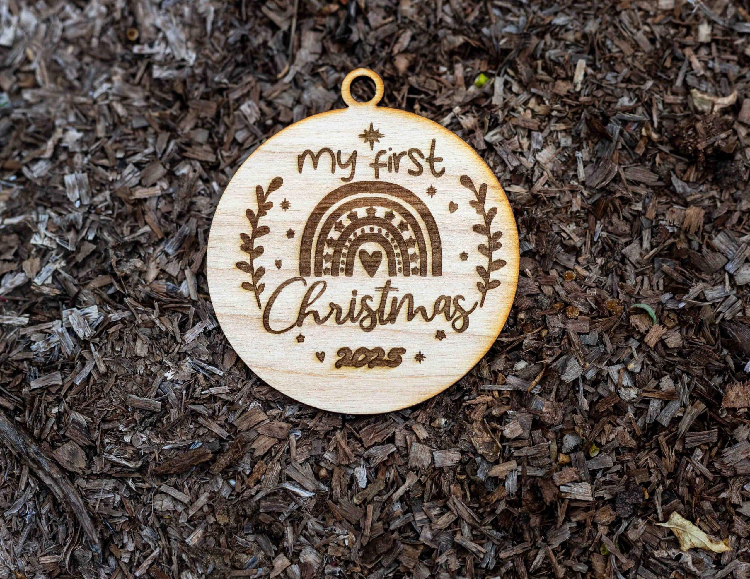 Különleges, 4 mm vastag nyír rétegelt lemezből készült karácsonyfadísz, amely tökéletes kiegészítője az ünnepi dekorációnak. Az Első karácsonyom karácsonyfadísz Szivárványos– lézervágott és gravírozott 8 cm átmérőjű díszek modern lézervágással és precíz gravírozással készülnek, így minden darab részletgazdag és természetes hatású.