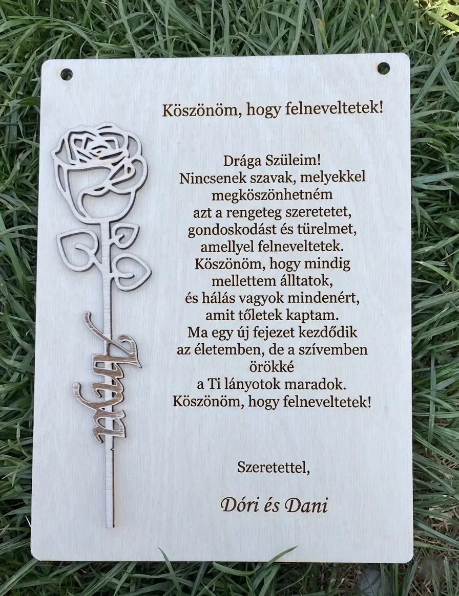 Az esküvő napja az egyik legalkalmasabb pillanat arra, hogy köszönetet mondj azoknak, akiknek a legtöbbet köszönheted. Ez az elegáns, fából készült emléktábla méltó és maradandó ajándék, amely a szülői ház falán örökké emlékeztetni fogja szeretteidet erre a különleges napra.
