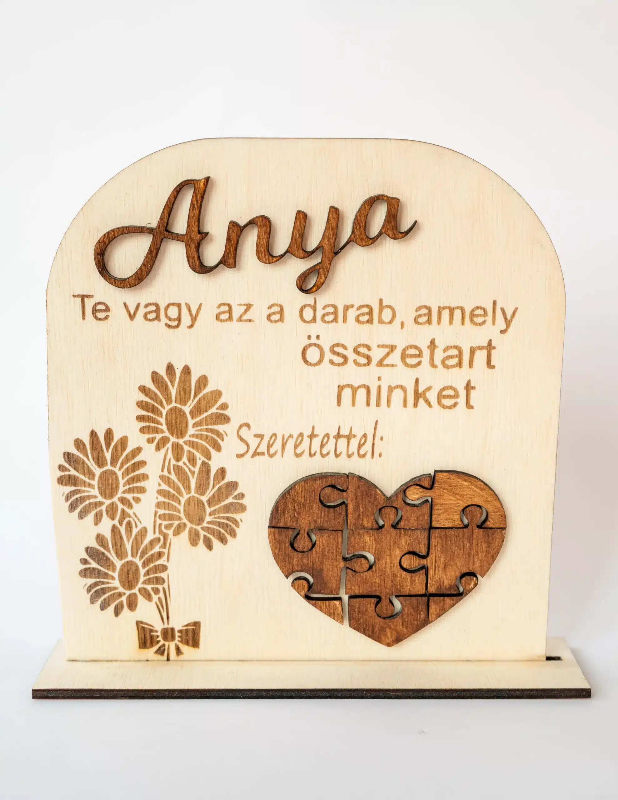 • 3D hatású elemek: A kiemelkedő, sötétbarna „Anya” felirat és a puzzle szív különleges mélységet és eleganciát ad a terméknek.