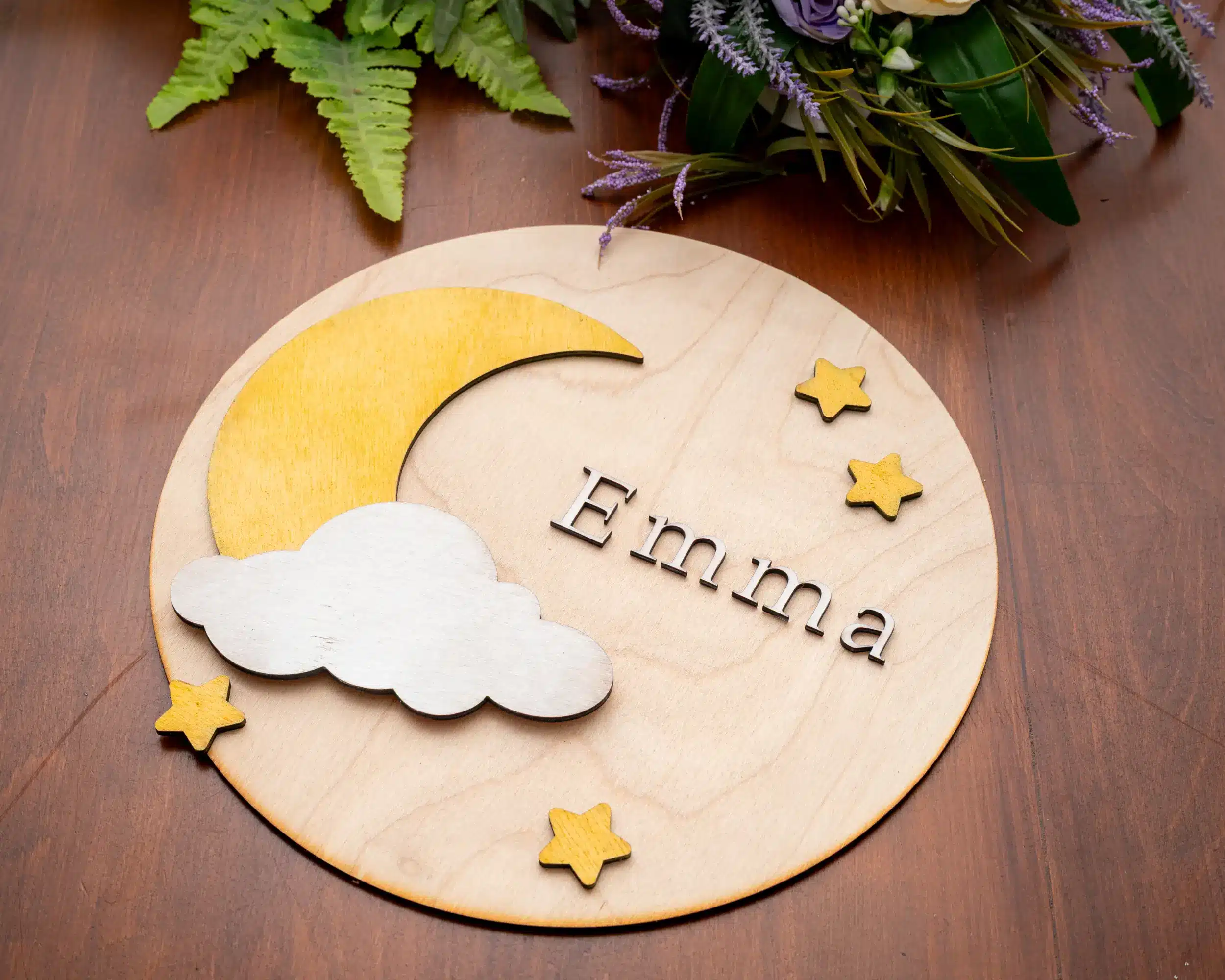 Ez a holdas és csillagos falidekor lágy, meghitt hangulatot teremt a babaszobában. A gyermek neve egyedileg kerül rá, így személyes ajándék babáknak és kisgyermekeknek.