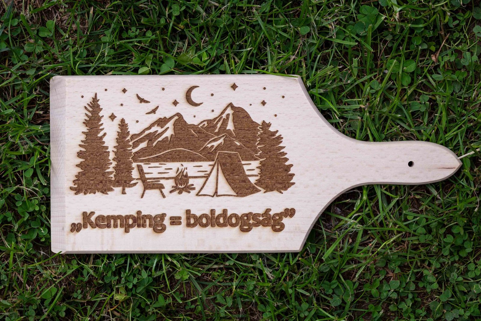 Ha szeretsz a természetben főzni, bográcsozni, grillezni vagy egyszerűen csak egy hangulatos pikniket tartani, akkor ez a gravírozott kempinges vágódeszka a legjobb társad lesz minden kiránduláson. A deszka nemcsak praktikus konyhai kiegészítő, hanem egyedi hangulatot is teremt: minden szelet kenyér, minden felaprított zöldség vagy húsdarab egy kicsit még finomabb lesz, amikor a természetben készül.