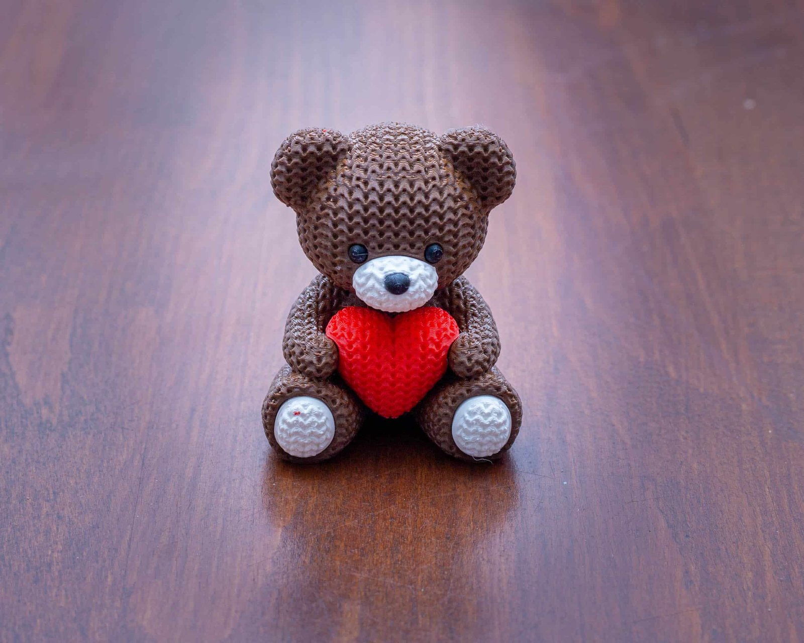 Ez az aranyos, részletgazdag 3D nyomtatott maci piros szívvel a kezében a szeretet és törődés tökéletes szimbóluma. Aprólékosan kidolgozott textúrája kötött hatású mintát idéz, ami különleges, kézműves megjelenést kölcsönöz neki.