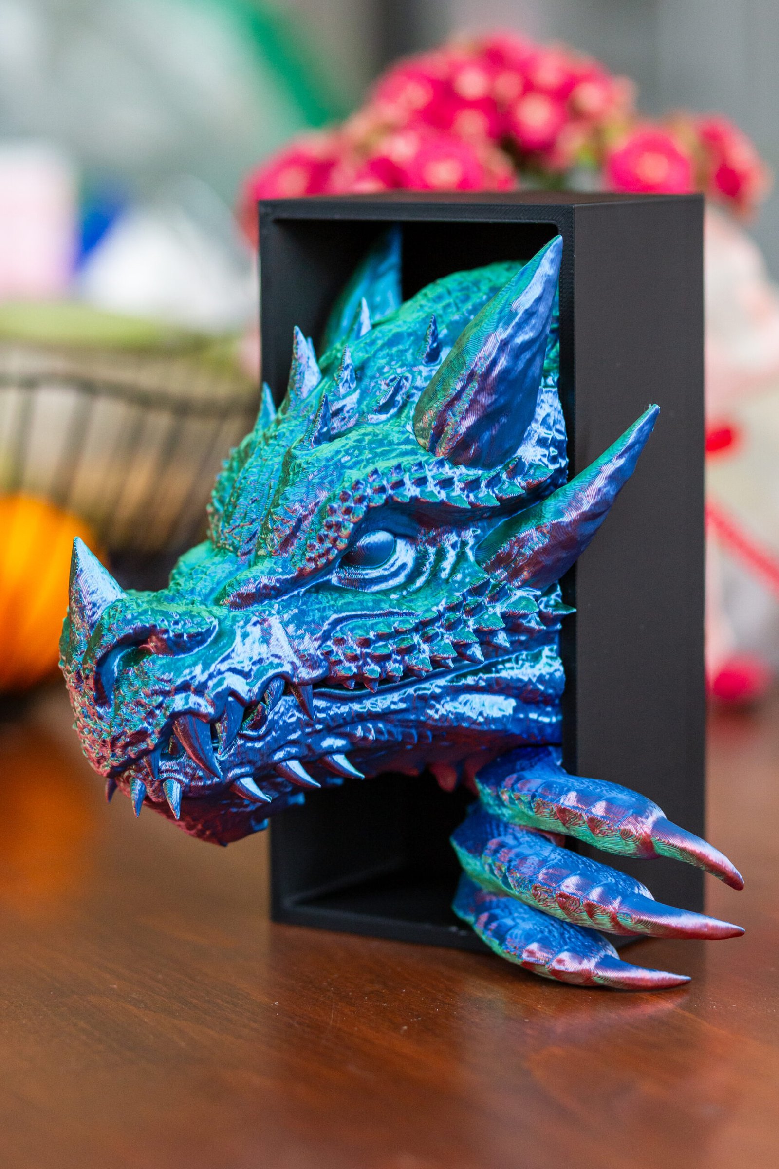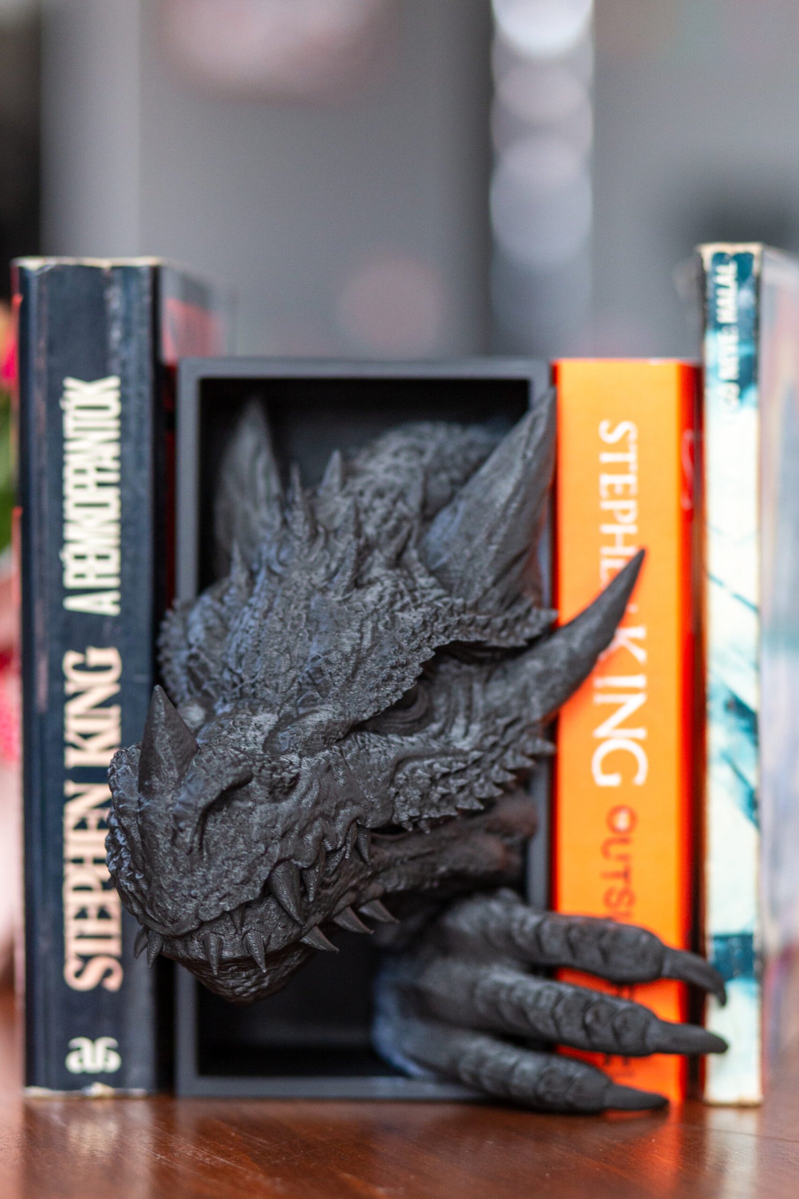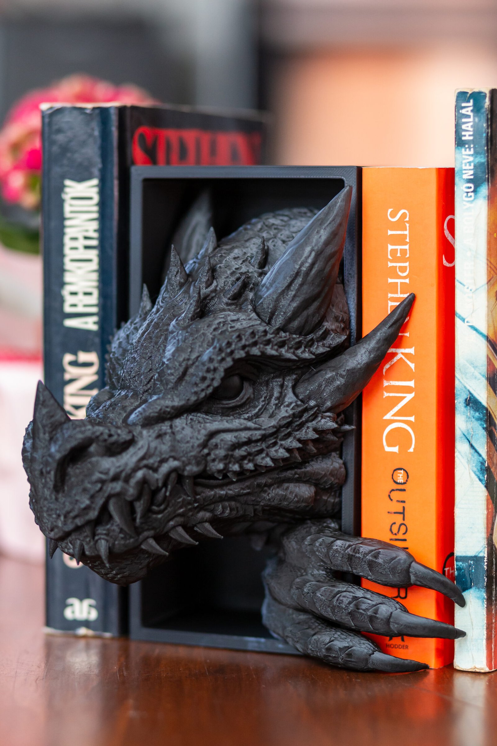 Ez a lenyűgöző, 3D nyomtatott könyvtámasz nemcsak praktikus, de látványos dísze is lehet könyvespolcodnak. A világító változat különösen éjszaka kel életre – a sárkány feje és teste misztikus fényben ragyog, mintha csak egy fantasy történetből lépett volna elő.